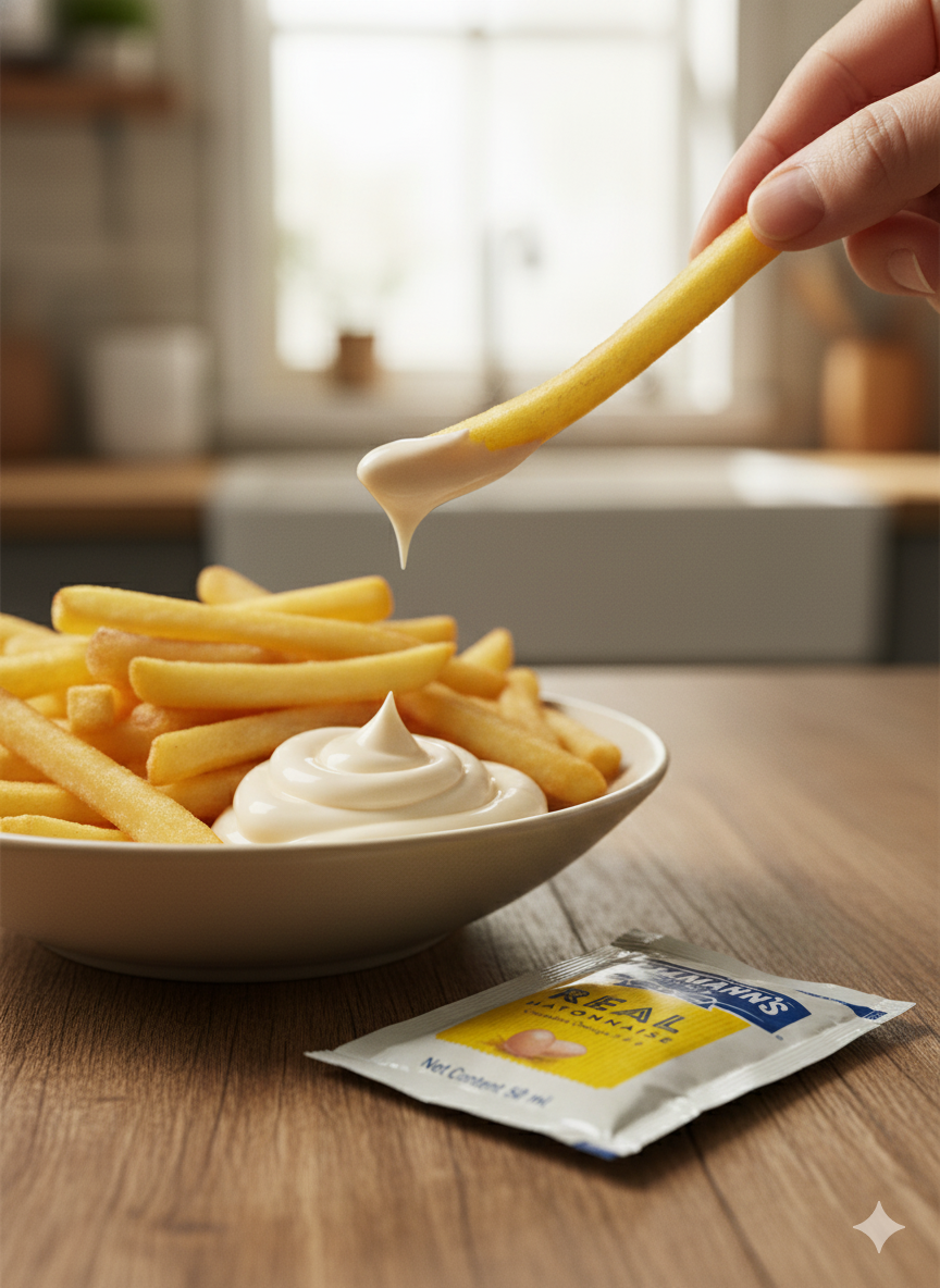 🍟 Khoai tây chiên chấm Xốt Hellmann’s – món ăn vặt giòn rụm, thơm béo khó cưỡng.