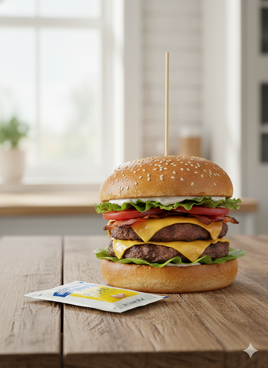 🍔 Burger bò phết Xốt Mayonnaise Hellmann’s – trọn vị béo ngậy, mềm mại trong từng miếng cắn.